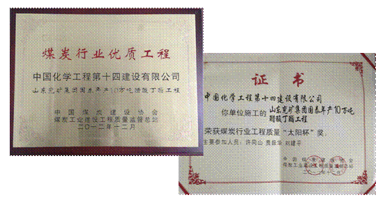 喜訊!5月7日,中國煤炭建設協(xié)會在陜西西安舉行煤炭建設行業(yè)創(chuàng)先爭優(yōu)表彰會,山東公司2011年承建的兗礦國泰10萬噸/年醋酸丁酯工程(罐區(qū)標段)榮獲煤炭行業(yè)“優(yōu)質工程”及煤炭行業(yè)工程質量“太陽杯”兩個獎項。