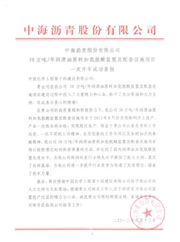9月17日,中海瀝青股份有限公司發(fā)來喜報(bào),就30萬噸/年潤滑油原料加氫脫酸裝置一次開車成功向公司報(bào)喜,對我方付出的大量精力和心血表示感謝,并對公司表達(dá)了良好的祝愿。