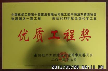 由中海油東營(yíng)港項(xiàng)目部承建的中海油東營(yíng)港油庫(kù)區(qū)原油罐區(qū)及油庫(kù)區(qū)公用工程,在項(xiàng)目部領(lǐng)導(dǎo)的精心組織下,通過(guò)全體參戰(zhàn)人員的共同努力,經(jīng)過(guò)十八個(gè)月的艱苦奮斗,順利的完成了各項(xiàng)施工任務(wù),得到了業(yè)主及上級(jí)領(lǐng)導(dǎo)的一致好評(píng),榮獲二○一三年度全國(guó)化學(xué)工業(yè)“優(yōu)質(zhì)工程獎(jiǎng)”的榮譽(yù)稱號(hào),為我公司提升了品牌形象。
