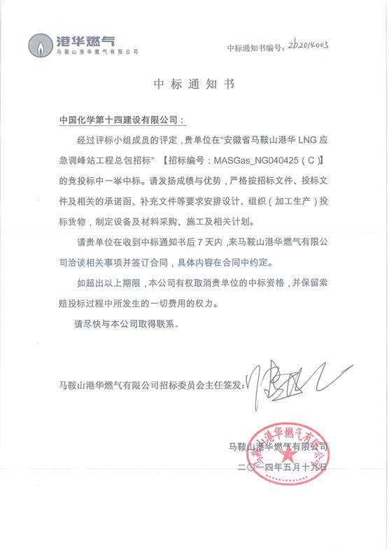 5月20日,公司再接喜訊,中標(biāo)馬鞍山港華燃?xì)庥邢薰抉R鞍山港華LNG應(yīng)急調(diào)峰站工程EPC總承包項目,中標(biāo)金額為1499.86萬元。