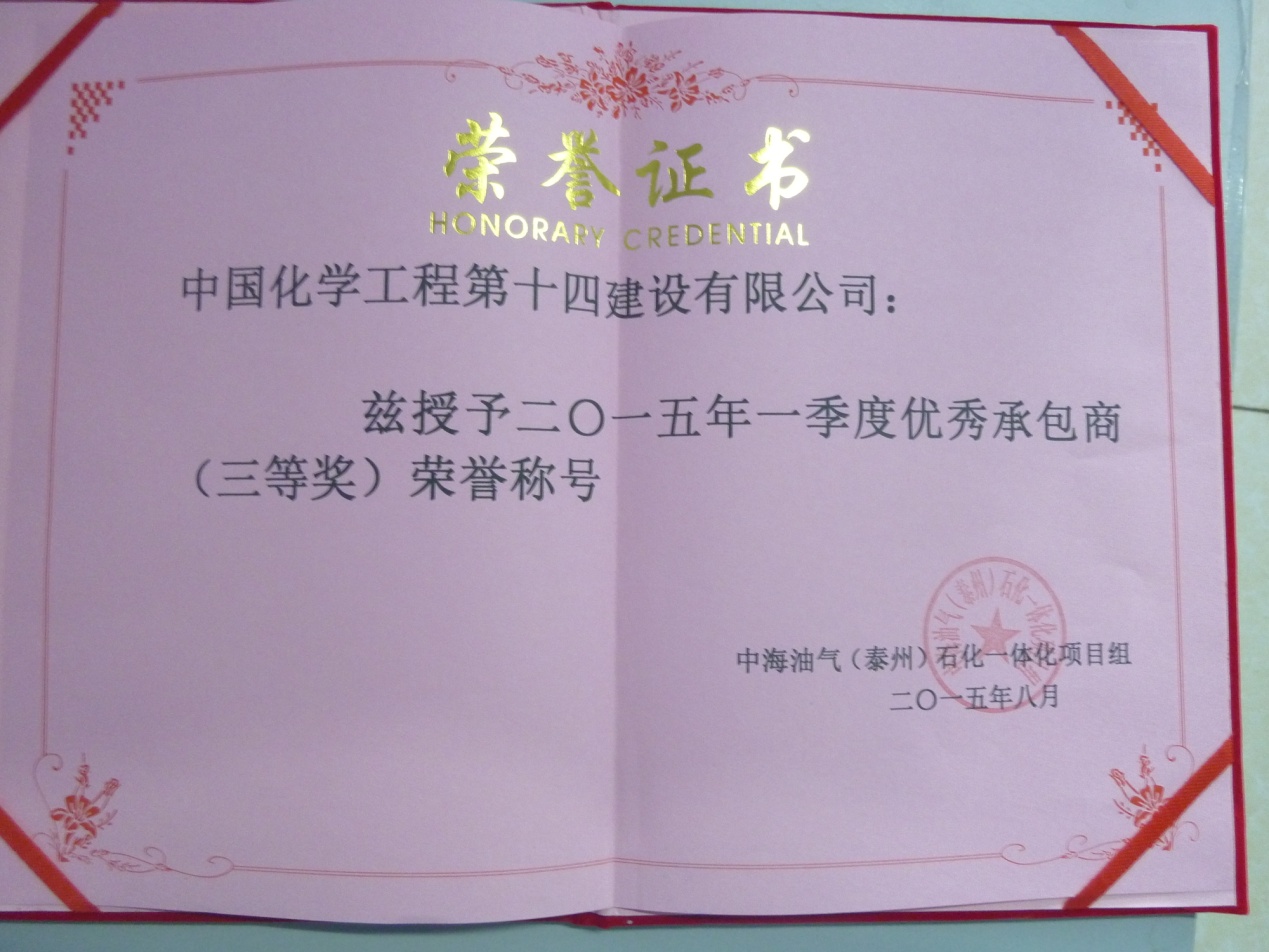 8月12日下午3點(diǎn)中海油辦公大樓會(huì)議室,南京機(jī)械廠泰州球罐PMT5項(xiàng)目榮獲中海油(泰州)一體化項(xiàng)目組第一季度優(yōu)秀承包商稱號(hào),并頒發(fā)了“優(yōu)秀承包商”榮譽(yù)證書(shū)。
