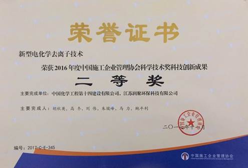 2017年12月20日,中國施工企業(yè)管理協(xié)會2016年度科技工作大會暨頒獎(jiǎng)會在北京召開,我公司的《新型電化學(xué)去離子技術(shù)》榮獲科技創(chuàng)新成果二等獎(jiǎng)。