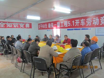 會(huì)上,項(xiàng)目經(jīng)理謝建寧下達(dá)了大干60天的施工作業(yè)計(jì)劃,宣讀了“大干60天 確保一期工程5.1開車”勞動(dòng)競(jìng)賽活動(dòng)實(shí)施方案并作了動(dòng)員:為確保實(shí)現(xiàn)“5.1”一期工程開車的計(jì)劃目標(biāo),向業(yè)主交一份滿意的答卷,項(xiàng)目部再次組織開展勞動(dòng)競(jìng)賽活動(dòng),希望各參戰(zhàn)施工隊(duì)嚴(yán)格按照作業(yè)計(jì)劃,周密安排、認(rèn)真組織、精心施工,充分發(fā)揚(yáng)十四化建人敢打、敢拼、敢打硬仗的精神,高度樹立“我比別人更努力,企業(yè)因我而發(fā)展”的企業(yè)價(jià)值觀。