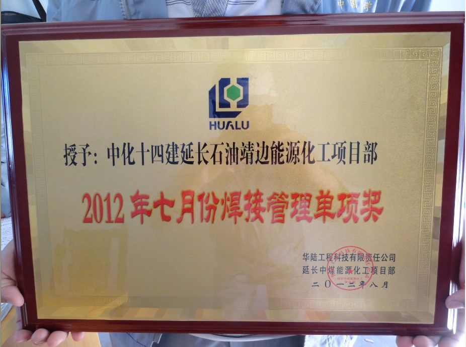 8月15日,華陸科技延長石油靖邊能源項目部召開了月度先進表彰大會。我公司靖邊項目部被授予“2012年七月份焊接管理單項獎”,起重工董德啟榮獲“2012年七月份HSE先進個人”榮譽稱號。