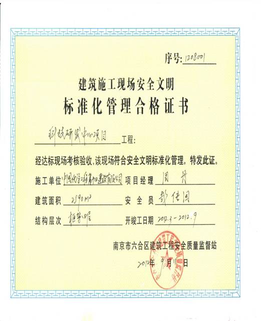 由我公司自建自用的科技研發(fā)中心工程,經(jīng)過南京市六合區(qū)建筑工程安全質(zhì)量監(jiān)督站標(biāo)化評(píng)審小組審查,于近日順利通過安全文明施工標(biāo)準(zhǔn)化工地驗(yàn)收,并于9月11日取得安全文明標(biāo)準(zhǔn)化管理合格證書。
