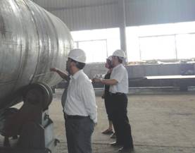 9月10日上午,山東濱洲中海瀝青股份有限公司工程部姜振平經(jīng)理和袁樹嵐工程師,在南京機(jī)械廠廠長(zhǎng)文志安等廠領(lǐng)導(dǎo)的陪同下,至南京機(jī)械廠察看容器車間設(shè)備制造情況。