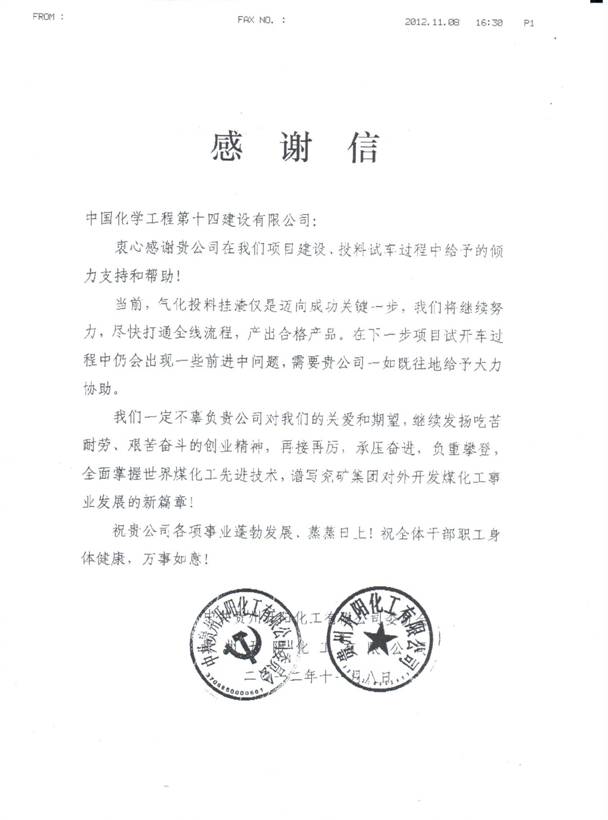 11月8日,貴州開(kāi)陽(yáng)化工有限公司向我公司發(fā)來(lái)感謝信,就我公司在項(xiàng)目建設(shè)、投料試車過(guò)程中給予的支持和幫助表示感謝。