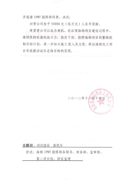 11月19日,鹽湖海納化工有限公司向我公司發(fā)來總經(jīng)理嘉獎令,就我公司在青海鹽湖海納化工有限公司聚氯乙烯一體化項目建設(shè)、投產(chǎn)過程中給予的支持和幫助表示感謝,并給予50000元人民幣獎勵。