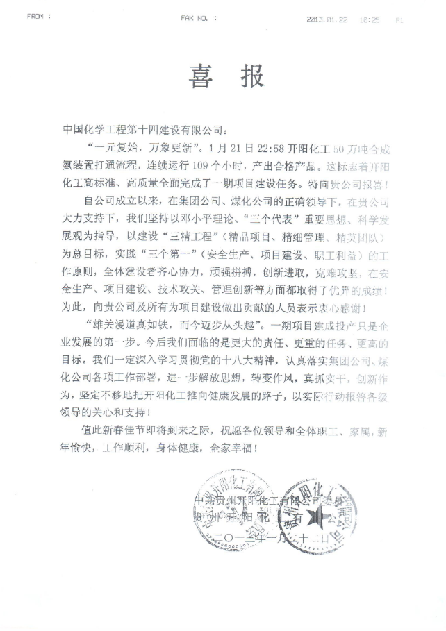 1月22日,貴州開陽(yáng)化工有限公司發(fā)來(lái)喜報(bào),就50萬(wàn)噸合成氨裝置一期項(xiàng)目產(chǎn)出合格產(chǎn)品向公司報(bào)喜。