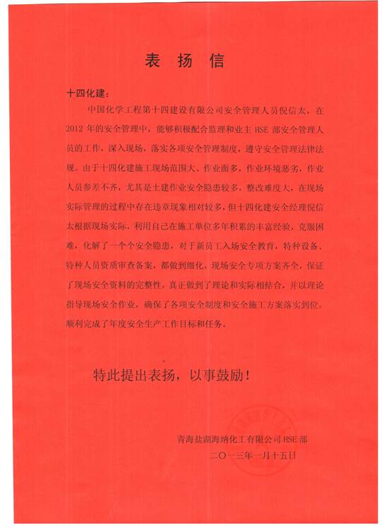 1月21日下午,由青海鹽湖海納聚氯乙烯一體化項目業(yè)主、監(jiān)理組織的年終會上,西北公司鹽湖海納項目經(jīng)理部倪信太同志受到業(yè)主與監(jiān)理HSE部門的表揚。