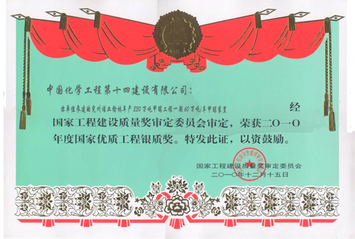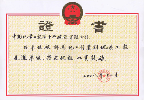 歷經(jīng)五十年不斷發(fā)展,公司憑借精湛的技術、豐厚的經(jīng)驗、雄厚的實力和優(yōu)質的服務,為國家化學工業(yè)發(fā)千余項精品工程,獲得“國務院嘉獎令”、“中國建筑工程魯班獎”,“國家百項經(jīng)典及精品工程獎”、“國家優(yōu)質工程金獎“國家優(yōu)質工程銀獎”、“全國優(yōu)秀焊接工程獎”、“全國優(yōu)秀吊裝工程獎”、“化學工業(yè)優(yōu)質工程獎”等各種嘉獎200余項;并多次被授予“全國優(yōu)秀施工企業(yè)”、”全國建筑業(yè)先進企業(yè)”、“全國用戶滿意施工企業(yè)”,“全國建筑業(yè)誠信企‘’全國建筑業(yè)AAA信用企業(yè)”、“全國重合同守信用企業(yè)”、“江蘇省知名建設承包商”等多種榮譽稱號。